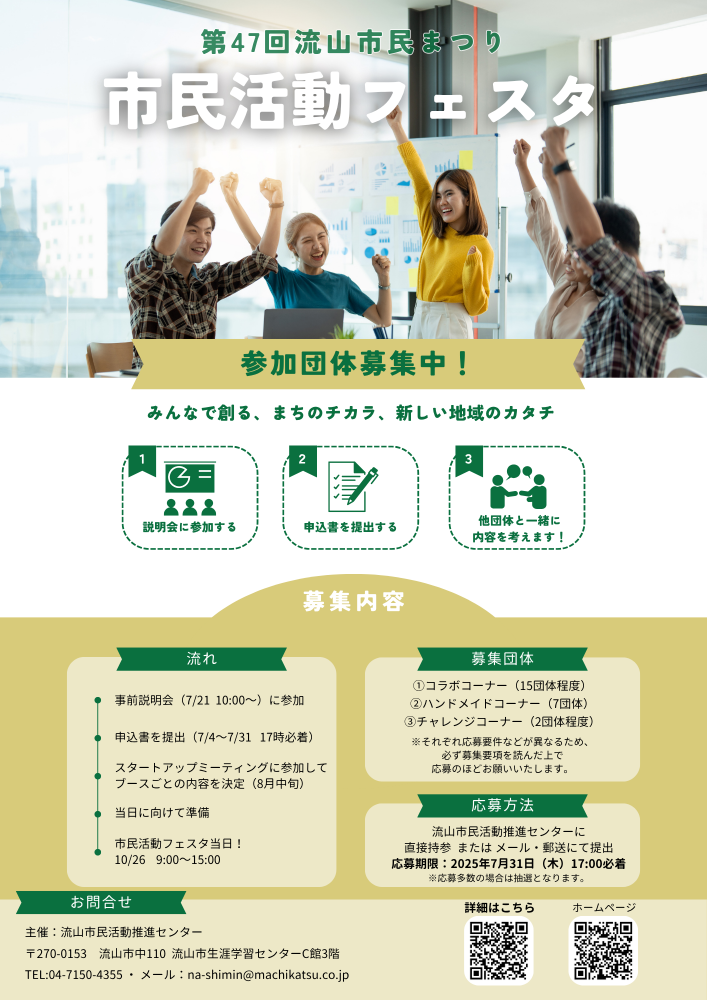 第47回流山市民まつり 10月26日(日)に開催する市民活動のお祭り、『市民活動フェスタ』に参加する団体の応募を開始します✨