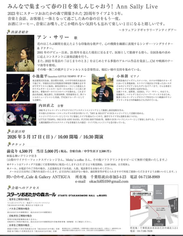 出演は医師でもありシンガーのアン・サリーさん、日本屈指のジャズピアニスト小林創さん、ギターに小池龍平、そして音響には内田直之さんをお迎えして最高のステージをお届けします。